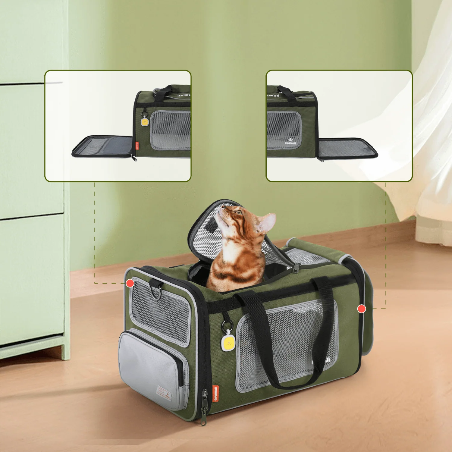 Spacious pet backpack made of high-density EVA for durability and comfort. Designed for cats of all ages, with a secure, light-proof double layer. Supports up to 15kg, perfect for travel and outdoor adventures. Ergonomic design ensures a comfortable carrying experience. Size: 43 × 27 × 30 cm.